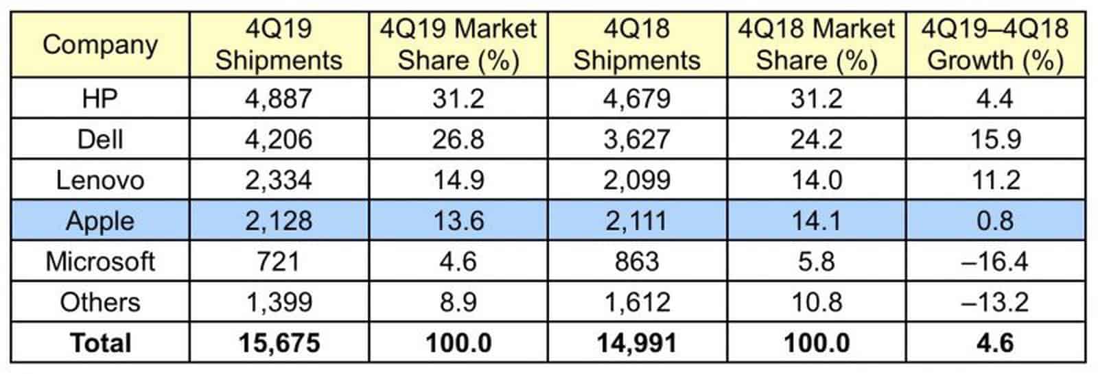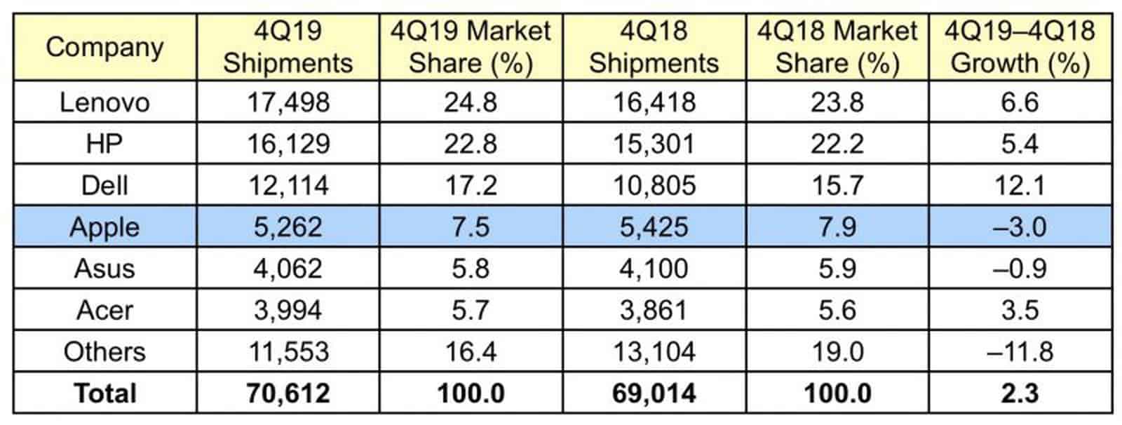 จากข้อมูลของ Gartner พบว่า ยอดขนส่งสินค้าคอมพิวเตอร์ Mac ของ Apple ร่วงในไตรมาสที่ 4 ปี 2019 ด้วยจำนวนประมาณ 5.26 ล้านเครื่อง ซึ่งลดลงจากช่วงเวลาเดียวกันของปีที่ผ่านมาที่เคยทำได้ 5.43 ล้านเครื่องหรือคิดเป็น 3%