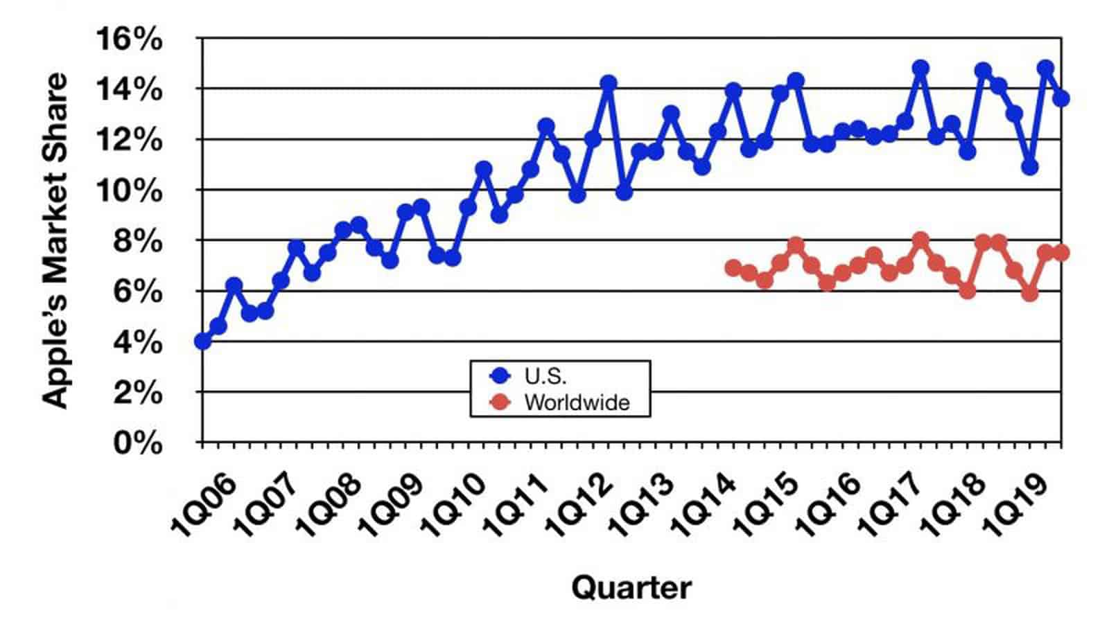 แต่ถ้าดูเฉพาะส่วนแบ่งตลาดของ Apple จะเห็นว่าในสหรัฐฯ ดีขึ้นเล็กน้อย จาก 2.11 ล้านเครื่องในไตรมาสที่ 4 ปี 2018 เพิ่มขึ้นเป็น 2.13 ล้านเครื่อง หรือคิดเป็น 0.8%