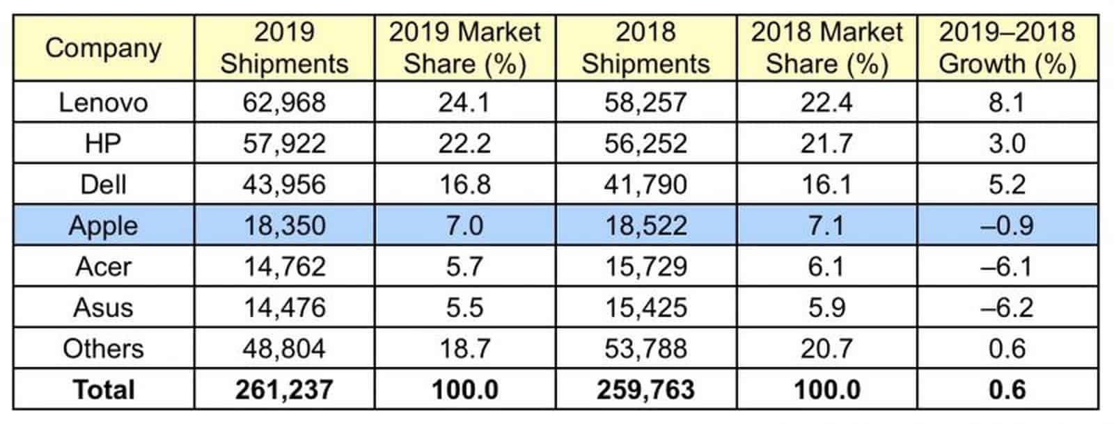 ทำให้ส่วนแบ่งทางการตลาดของ Apple ก็ร่วงลงมาด้วย จากเดิมที่เคยได้ 7.9% ในไตรมาสที่ 4 ปี 2018 ก็ร่วงลงมาอยู่ที่ 7.5% แต่ส่วนแบ่งการตลาดของตลาด PC กลับเติบโตขึ้นเป็นครั้งแรก เหตุผลหลักๆน่าจะมาจากการอัพเกรดของระบบปฏิบัติการ Windows 10 และจะเห็นว่า Apple ยังคงอยู่ในอันดับที่ 4 ของส่วนแบ่งทางการตลาดโลกของ PC Vendor โดยตามหลัง Lenovo HP และ Dell ที่ครองอันดับ 1 2 และ 3