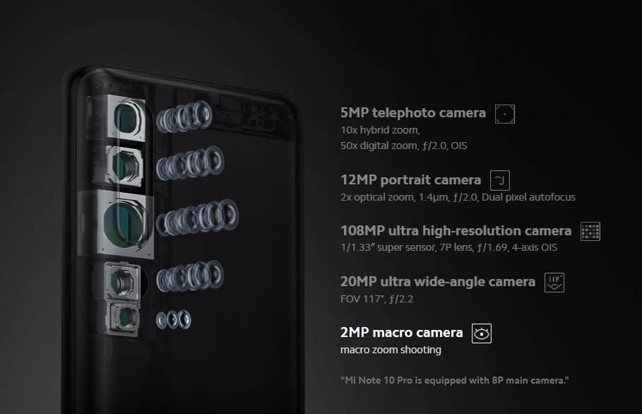 ตัวกล้องหลังจะเป็น 5 ตัวเหมือนกัน จะมีความแตกต่างกันตรงที่กล้องหลัก 108 ล้านพิกเซล ในMi Note 10 จะเป็น 7 ชิ้นเลนส์ ส่วนMi Note 10 Pro จะเพิ่มขึ้นมาเป็น 8 ชิ้นเลนส์ ที่ช่วยให้สามารถเก็บภาพได้คมชัดมากขึ้นไปอีก