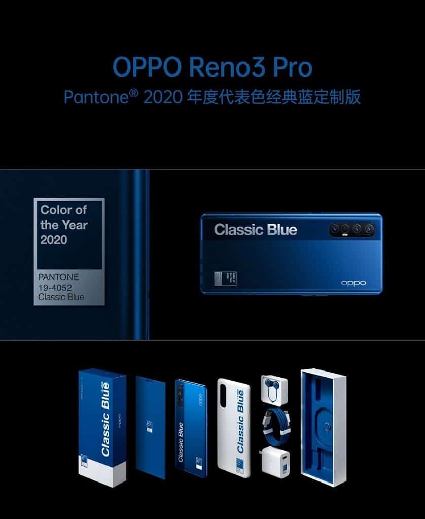 OPPO Reno3 Pro Pantone 2020 Special Edition จะใช้สี classic blue สีของปี 2020 ซึ่งแพคเกจที่บรรจุ จะมี 2 สี คือ สี classic blue กับ สีขาว