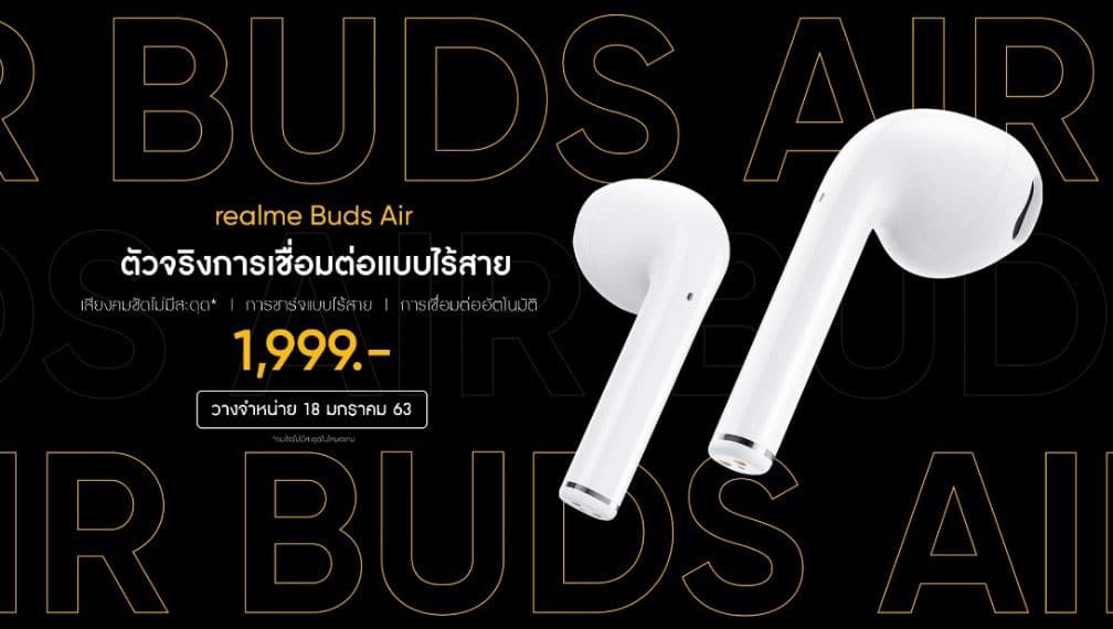 นอกจากนี้ realme ยังเปิดตัวไอเท็มสุดพิเศษ realme Buds Airหูฟังไร้สายที่จะช่วยสร้างอรรถรสเสียงของคุณให้มีคุณภาพและยกระดับการใช้ชีวิตของคุณให้ง่ายมากขึ้น การันตีความแรงโดยรางวัลยอดขายอันดับ 1 จาก Flash Sale ใน Shopee และ Lazada พร้อมวางจำหน่ายในวันที่ 18 มกราคมนี้ ในราคาเพียง 1,999 บาท ที่ realme Brand Shop ช่องทางออนไลน์ที่ Lazada และ Shopee