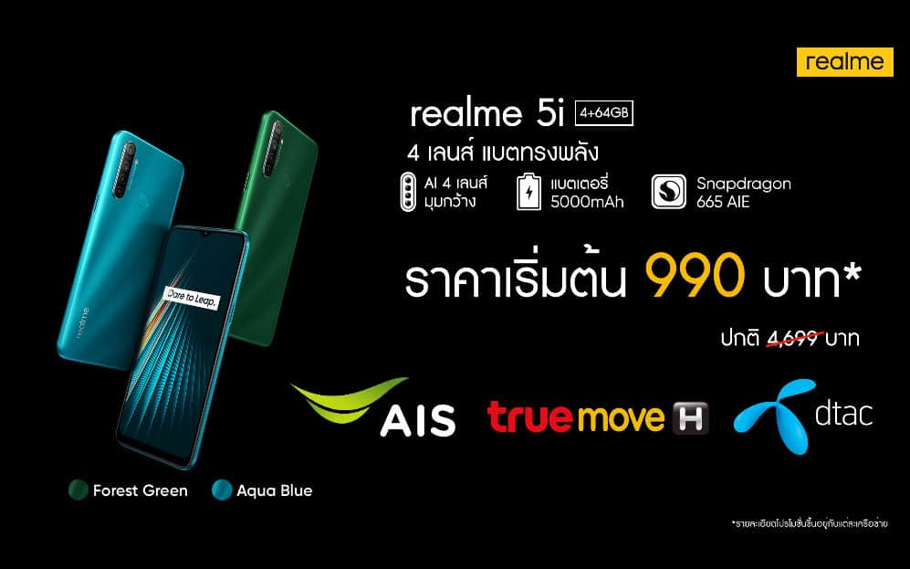 realme 5i วางจำหน่ายในราคาสุดคุ้มสำหรับความจุ 4+64GB ในราคาเพียง 4,699 บาท และความจุ 4 + 128 GB ในราคาเพียง 4,999 บาทที่ realme Brand Shop หรือตัวแทนจำหน่ายทั่วประเทศ และช่องทางออนไลน์ Lazada และ Shopee พิเศษ! สำหรับลูกค้า AIS, TrueMove H และ DTAC สามารถเป็นเจ้าของ realme 5i ความจุ 4+64 GB ในราคาเริ่มต้นเพียง 990 บาท
