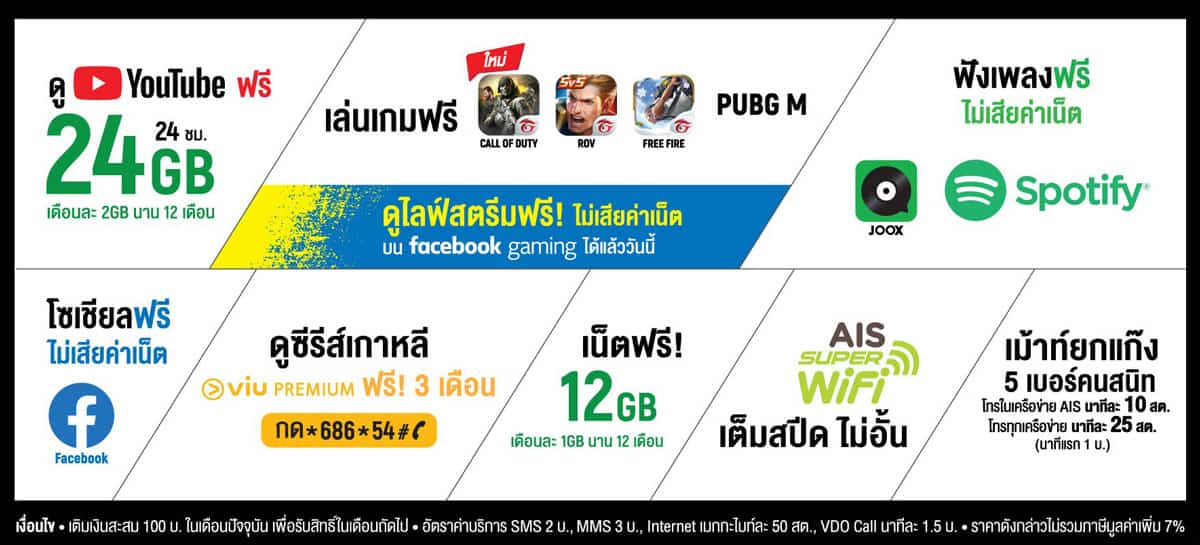 - ดู YouTube 24 GB ตลอด 24 ชม. (เดือนละ 2 GB/เดือน นาน 12 เดือน)