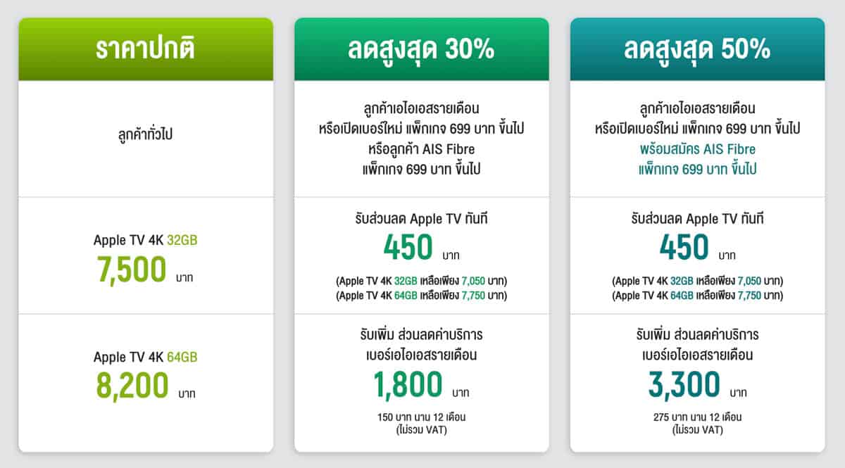 ข้อเสนอสุดพิเศษ จาก เอไอเอส ด้วย โปรโมชั่น Apple TV 4K จากราคาปกติ รุ่นความจุ 32GB ราคา 7,500 บาท และรุ่นความจุ 64GB ราคา 8,400 บาท รับส่วนลดสูงสุด 50%