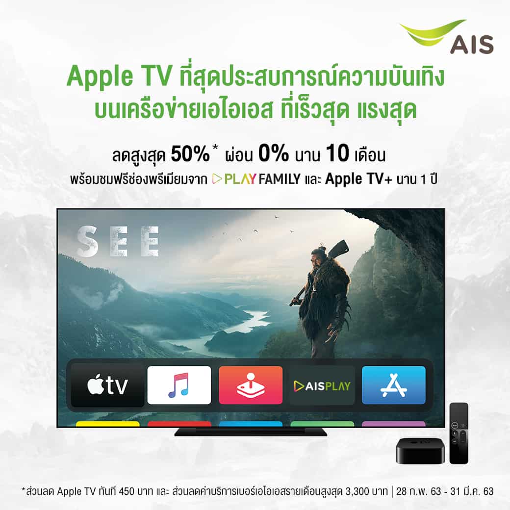- ลูกค้าปัจจุบันและลูกค้าใหม่ที่ใช้แพ็กเกจแบบรายเดือนขั้นต่ำ 699 บาท จะได้รับส่วนลด 450 บาท เมื่อซื้อ Apple TV 4K และส่วนลดค่าบริการรายเดือน 1,800 บาท (150 บาท/เดือน เป็นระยะเวลานาน 12 เดือน) พร้อมกับแพ็กเกจ PLAY FAMILY มูลค่า 119 บาทฟรี 12 เดือน เมื่อซื้อ Apple TV 4K กับ เอไอเอส ระหว่างวันที่ 28 กุมภาพันธ์ – 31 มีนาคม 2563
