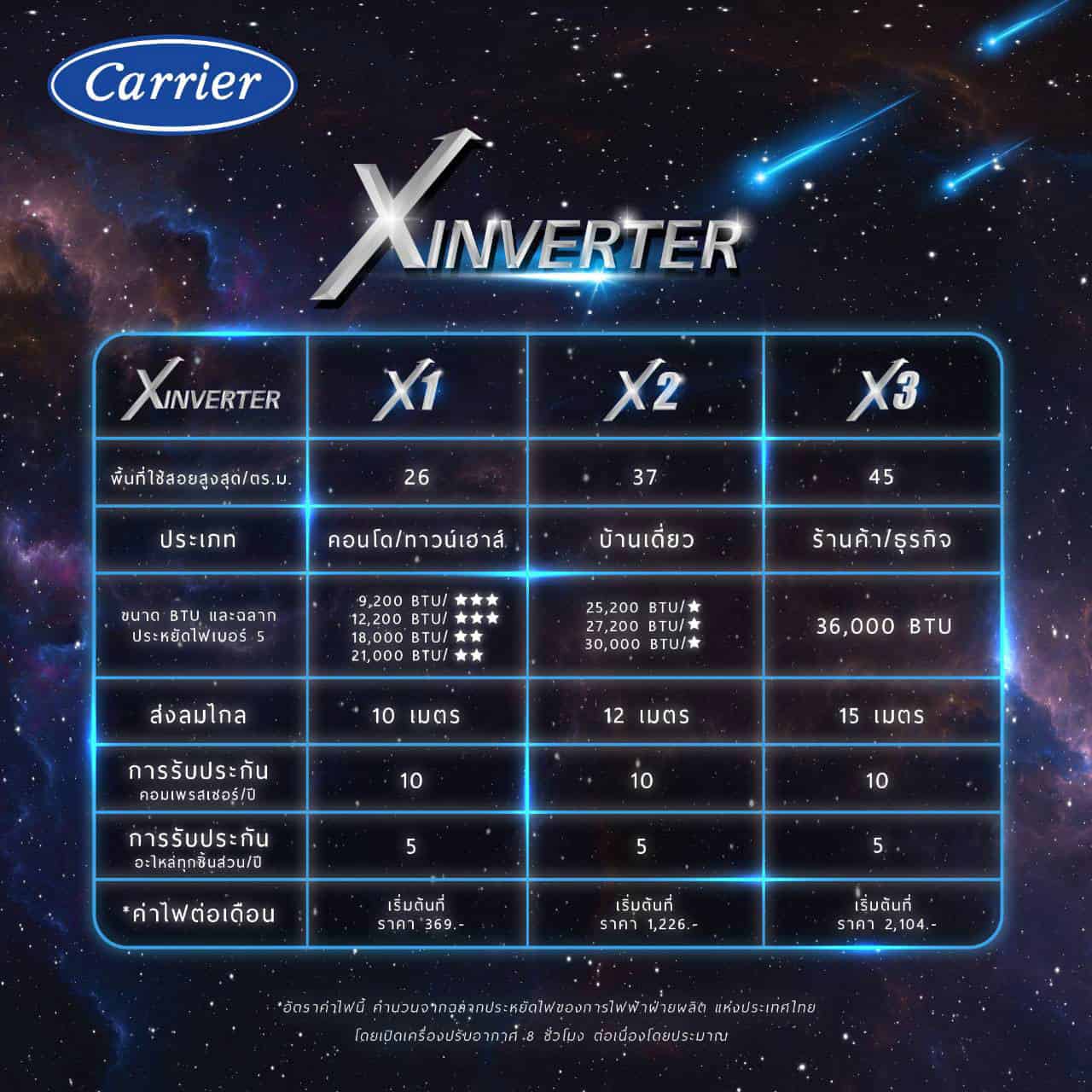 - Carrier X Inverter X1 เน้นเรื่องประหยัดพลังงาน ตามมาตรฐานไฟ เบอร์ 5 สูงสุด 3 ดาว