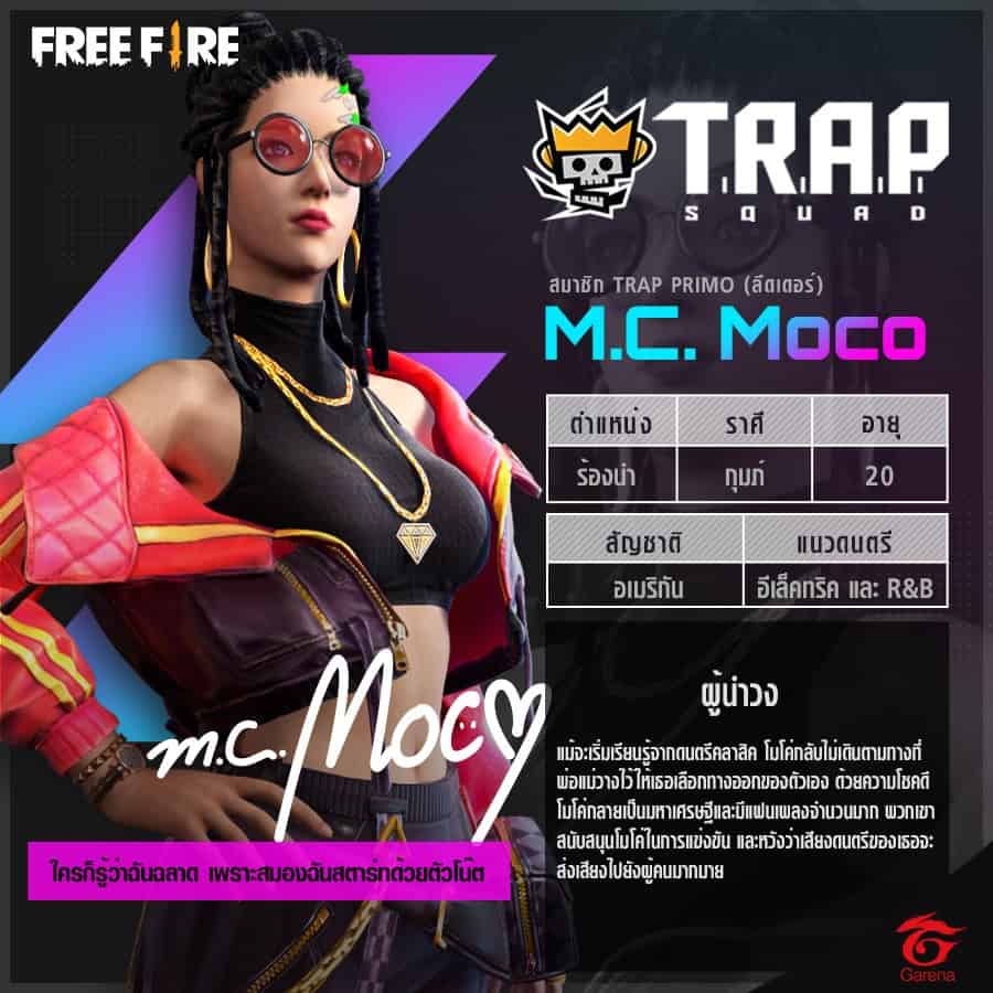 Garena Free Fire เปิดตัวโปรเจ็กต์ใหม่ โดยใช้ชื่อว่า T.R.A.P. Rapper Squad ครั้งแรกที่มีการฟอร์มทีม Rapperโดยใช้ตัวละครในเกมคือ M.C.Moco, DJ Miguel, Killa K และ A to the O