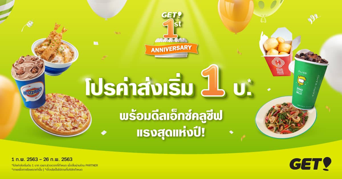 ฉลองครบรอบ 1 ปี กับ “GET 1st Anniversary” แจกคูปองค่าส่ง 1 บาททุกวัน (ภายในระยะ 5 กม.) สามารถเข้ามาเก็บคูปองได้ 2 รอบ ตั้งแต่ช่วงบ่ายโมงและ 1 ทุ่มตรงของทุกวัน จนกว่าคูปองจะหมด (คูปองสามารถใช้ได้ภายในวันเดียวกัน) แจกทุกวันตลอดช่วงแคมเปญ พร้อมพบส่วนลดจากร้านชั้นนำมากมายที่ยกขบวนมาร่วมฉลอง ลดสูงสุดถึง 50% และโปรซื้อ 1 แถม 1 ทั้งจากร้านแบรนด์ดังและร้านยอดนิยมมากมาย อาทิ ร้านอาหารญี่ปุ่นเซ็น เขียง ฮั่วเซ่งฮงติ่มซำ ดังกิ้น แดรี่ควีน คามุ ที และอื่นๆ เริ่มตั้งแต่วันนี้ – 26 กุมภาพันธ์ 63