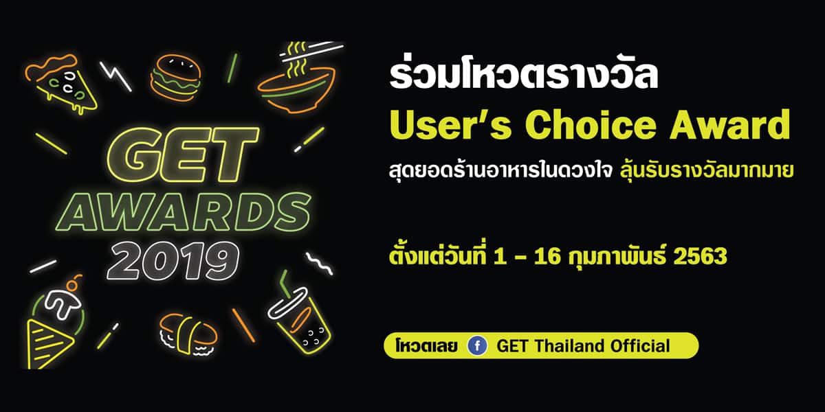 - โหวต USER’S CHOICE AWARD ให้ร้านโปรดในดวงใจได้ทางเฟซบุ๊ค GET THAILAND OFFICIAL ได้ตั้งแต่วันที่ 1 -16 กุมภาพันธ์ 2563
