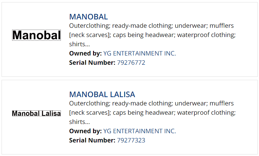 สื่อออนไลน์เกาหลีใต้รายงานว่า YG Entertainment ได้ยื่นจดทะเบียนเครื่องหมายการค้าชื่อ “Lalisa Manobal” และ “Manobal” ซึ่งเป็นชื่อจริงของ Lisa Blackpink โดยเนื้อหาระบุว่า เป็นเครื่องหมายการค้าสำหรับหมวดเสื้อผ้า