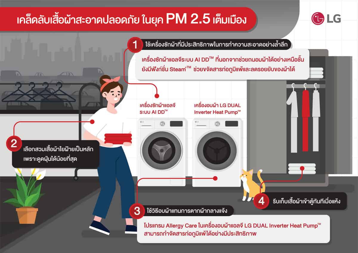 คนไทยยังคงเผชิญปัญหามลพิษทางอากาศจากฝุ่นละอองขนาดเล็ก PM 2.5 เพื่อป้องกันตนเองจากความเสี่ยงการเกิดโรคอันตราย LG จึงขอนำเสนอการดูแลเสื้อผ้าให้สะอาดดังนี้