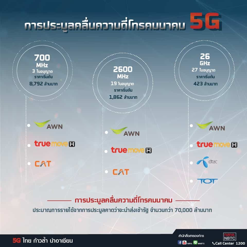 - Dtac ได้ไป 2 ชุด คือ 26.8-27.0 GHz มีราคาสุดท้าย 910,400,001 บาท