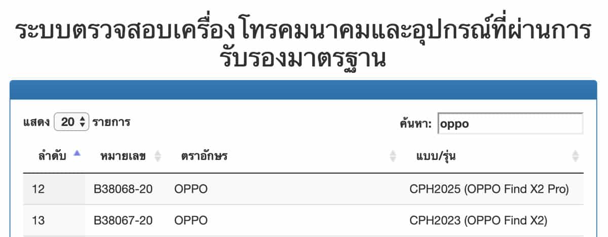ข้อมูลยืนยันจาก ระบบตรวจสอบเครื่องโทรคมนาคมและอุปกรณ์ที่ผ่านการรับรองมาตรฐาน ของ กสทช. ที่ตอนนี้มีรายชื่อสมาร์ทโฟนรุ่นใหม่ ของออปโป้ ปรากฏในระบบเรียบร้อยแล้ว คือ CPH2023 ซึ่งเป็นรหัสของ OPPO Find X2 และที่น่าสนใจก็คือ ยังมีอีกรุ่นที่เป็นรหัส CPH2025 ระบุชื่อรุ่นคือ OPPO Find X2 Pro