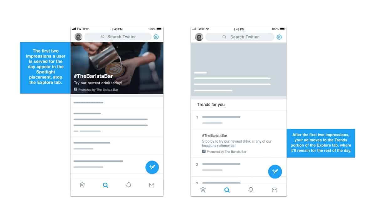 ทั้งนี้ Promoted Trend Spotlight จะเข้ามาเสริมฟีเจอร์โฆษณา Promoted Trend เดิม ด้วยการเพิ่มลูกเล่นในการใช้วิดีโอความยาว 6 วินาที, ภาพ GIFs หรือภาพนิ่ง แสดงบนแท็บ Explore บน Twitter โดยผู้ใช้งานทวิตเตอร์ที่ล็อกอินเข้ามาบนทวิตเตอร์จะสามารถมองเห็นคอนเทนท์ของแบรนด์ได้ถึง 2 ครั้งต่อวัน และยังให้อิสระกับแบรนด์ในการสลับสับเปลี่ยนอาร์ตเวิร์คโฆษณาได้ตลอดทั้งวัน เพื่อให้สามารถเข้าถึงกลุ่มลูกค้าได้ดียิ่งขึ้น หากผู้ใช้งานทวิตเตอร์ได้มีการคลิกเข้ามาชมโฆษณา 2 ครั้งภายในวันนั้นแล้ว โฆษณาตัวนั้นจะถูกย้ายไปเป็นโฆษณาแบบ Promoted Trend ปกติและจะเห็นคอนเทนท์แบบออร์แกนิกแทน