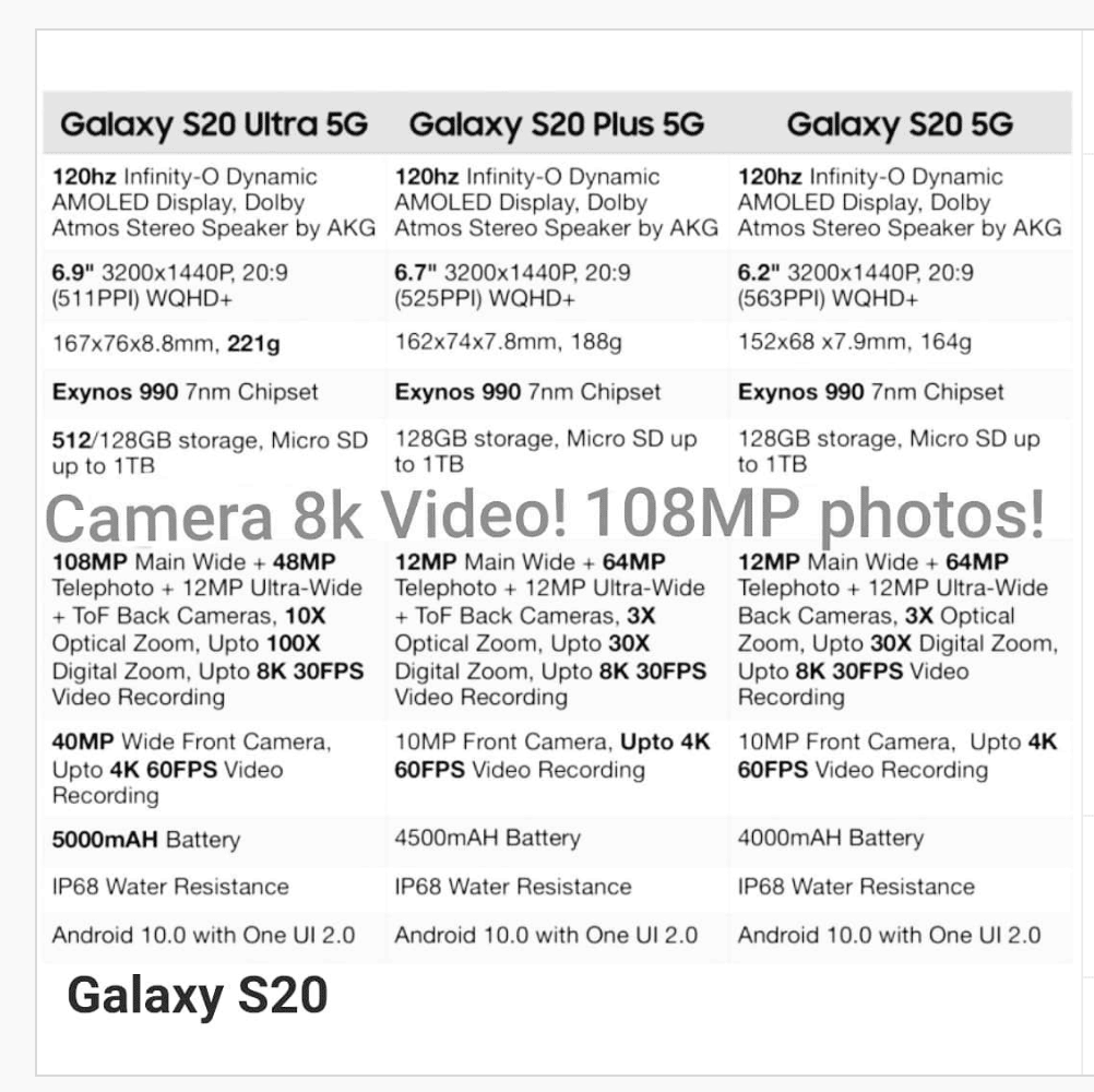 ข้อมูลของกล้องหลังที่จะมาพร้อมกับความละเอียดสูงถึง 108 ล้านพิกเซล เพราะในปีที่แล้วซัมซุุงได้แถลงข่าวเปิดตัว เซ็นเซอร์กล้อง ISOCELL Bright HMX ที่สามารถถ่ายภาพความละเอียด 108 ล้านพิกเซลรุ่นแรกของโลก ซึ่งเป็นความละเอียดที่สูงมากๆ ชนิดที่ว่ากล้อง DSLR ระดับมืออาชีพยังไม่สามารถเก็บความละเอียดของภาพได้ถึงระดับนี้ แต่ว่ามันจะมาอยู่ในสมาร์ทโฟน Samsung Galaxy S20