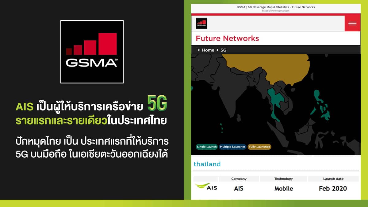GSMA ประกาศรับรอง AIS เป็นผู้ให้บริการเครือข่าย 5G รายแรกและรายเดียวในประเทศไทย ปักหมุดไทย เป็น ประเทศแรกที่ให้บริการ 5G บนมือถือในเอเชียตะวันออกเฉียงใต้