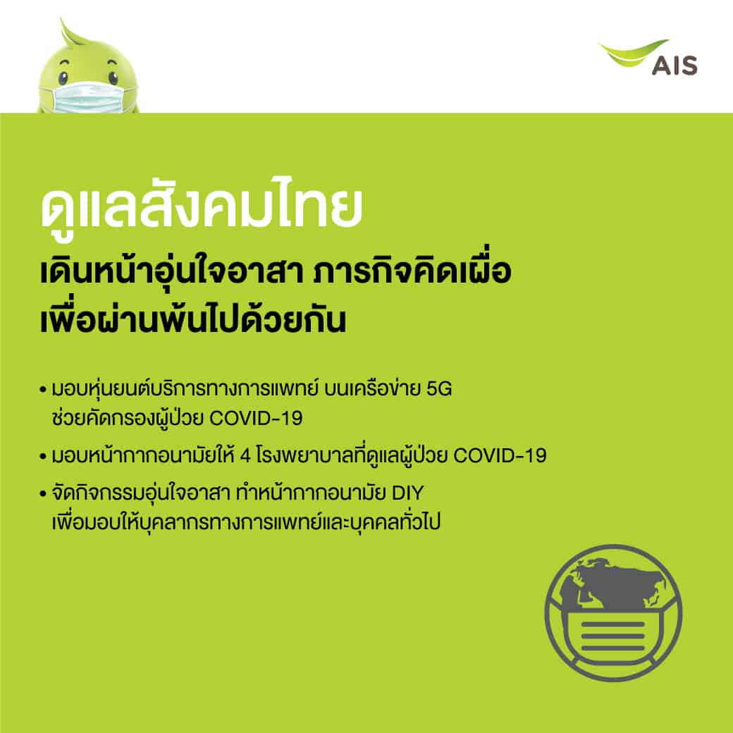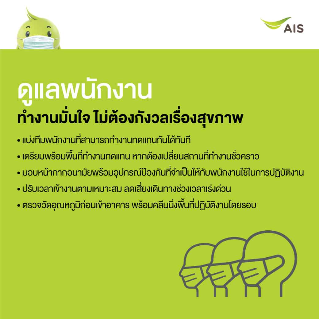 AIS เน้นไปที่การให้ความสำคัญต่อสุขภาพอนามัยและความปลอดภัยของลูกค้าที่เข้ามาใช้บริการ, บุคลากร, ตัวแทนจำหน่ายและพาร์ทเนอร์ที่ร่วมทำงานกับทุกฝ่าย