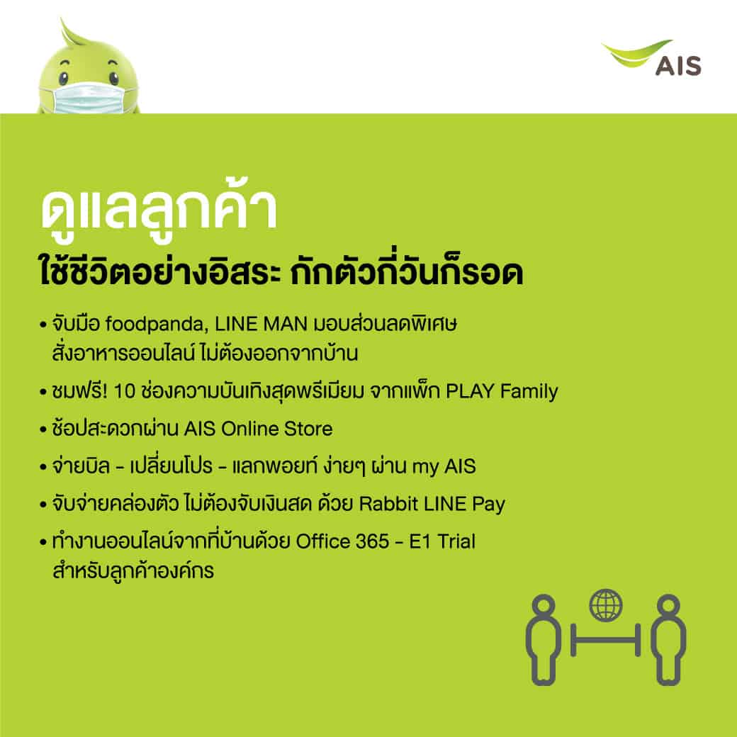 โดยทีมแพทย์ผู้เชี่ยวชาญมาให้คำแนะนำการดูแลตัวเองและคนในครอบครัวอย่างต่อเนื่องอีกด้วย นางสาววราลี กล่าวในตอนท้ายว่า “ขอให้ลูกค้ามั่นใจว่า เอไอเอสได้มีมาตรการเตรียมความพร้อมรับมือสถานการณ์นี้อย่างเต็มที่ เพื่อส่งมอบบริการที่ดีที่สุดอย่างต่อเนื่อง อย่างไรก็ตามเพื่ออำนวยความสะดวกและมอบความอุ่นใจ เราได้จัดเตรียมช่องทางใช้บริการ Online ผ่านทาง Application my AIS และ AIS Online Store ไว้เป็นทางเลือกด้วยเช่นกัน”