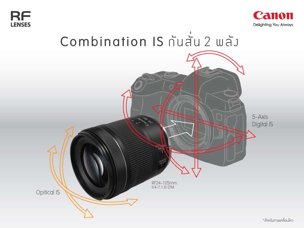 ด้วยการสื่อสารที่รวดเร็วระหว่างกล้องกับเลนส์ผ่านเมาท์ RF ประสิทธิภาพสูง ระบบป้องกันภาพสั่นไหวจึงทำงานได้อย่างแม่นยำมากขึ้น RF24-105mm F4-7.1 IS STM มีระบบป้องกันภาพสั่นไหว Dual Sensing IS สำหรับการถ่ายภาพนิ่ง ตรวจจับการสั่นด้วยเซ็นเซอร์ไจโรในเลนส์และข้อมูลจากเซ็นเซอร์ CMOS ในกล้อง จึงสามารถตรวจจับและแก้ไขการสั่นความถี่ต่ำ เช่น การเคลื่อนไหวของร่างกายจากการหายใจ ได้อย่างมีประสิทธิภาพมากขึ้น ป้องกันภาพสั่นไหวได้เทียบเท่าความเร็วชัตเตอร์สูงสุด 5 สต็อป (ตามมาตรฐาน CIPA เมื่อใช้กับกล้อง EOS R และทางยาวโฟกัส 105 มม.)