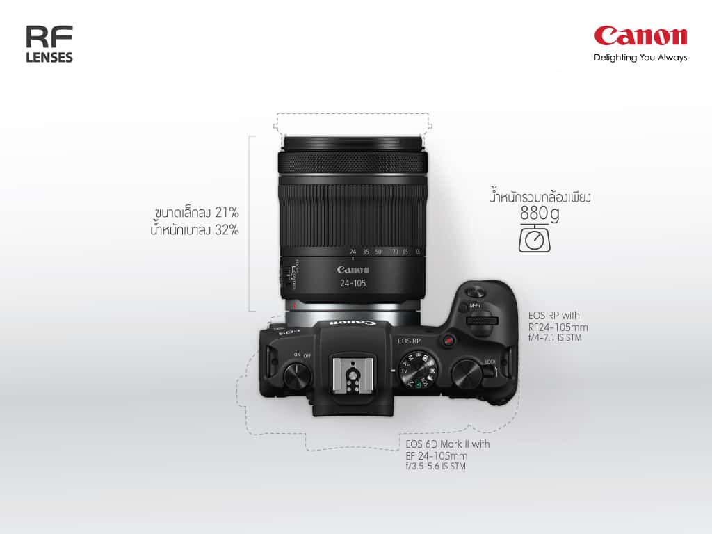 เด่นด้วยขนาดเล็กและเบากว่าเลนส์ที่มีทางยาวโฟกัสเท่ากันอย่าง EF24-105mm F3.5-5.6 IS STM โดยสั้นกว่า 15.2 มม. และเบากว่า 130 กรัม ให้สมดุลที่ดีเยี่ยมเมื่อใช้กับกล้องมิเรอร์เลสฟูลเฟรมตระกูล EOS Rการเป็นเลนส์ที่ใช้กับเมาท์ RF ที่มีเส้นผ่านศูนย์กลางกว้างและระยะแบ็คโฟกัสสั้น ประกอบกับโครงสร้างภายในที่ชิ้นเลนส์หลังสุดมีขนาดใหญ่กว่าในเลนส์คิทของกล้องฟูลเฟรมทั่วไป ทำให้ RF24-105mm F4-7.1 IS STM ให้ภาพคุณภาพสูงและมีขนาดกะทัดรัดขึ้น