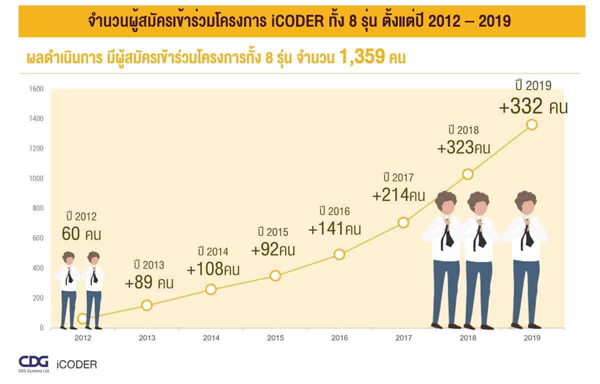 ประเทศไทยจัดอันดับให้สายงาน IT เป็นอาชีพสำหรับเด็กจบใหม่ที่มีโอกาสเติบโตและได้รับเงินเดือนสูงอันดับต้นๆ ซีดีจีสบช่องเร่งสานต่อดำเนิน iCODER โครงการนักพัฒนาโปรแกรมมืออาชีพมุ่งสนับสนุนเส้นทางการเรียนรู้ด้านสายงานไอทีปีที่ 9 เปิดรับสมัครแล้ววันนี้ – 20 มีนาคมนี้ เผยทั้ง 8 รุ่น มีผู้เข้าร่วมกิจกรรมร่วมงานกับกลุ่มบริษัทซีดีจีแล้วทั้งสิ้น 81 คนโดยในปีที่ผ่านมามีผู้ที่ได้รับทุนการศึกษาและเทิร์นเป็นพนักงานของกลุ่มบริษัทซีดีจีเพิ่มอีก 12 คน ตั้งเป้าปั้นบุคลากรไอทีออกสู่ตลาดแรงงานเพิ่มกว่า 100 คนต่อปี