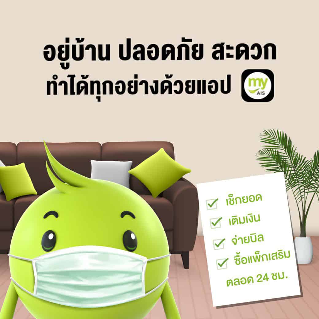- my AIS app ให้บริการเช็กยอดค่าใช้จ่าย, เติมเงิน, จ่ายบิล, ซื้อแพ็กเกจเสริมได้ 24 ชั่วโมง ข้อมูลเพิ่มเติมทาง https://myais.ais.co.th/
