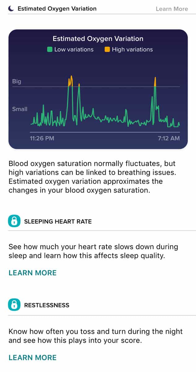 โดยผู้ใช้สามารถตรวจสอบผลการวัดผ่านกราฟบนแอปพลิเคชันฟิตบิท บริเวณด้านล่างของผลลัพธ์จากฟังก์ชันการนอนหลับ ซึ่งอุปกรณ์ฟิตบิทจะประมวลผลในขณะที่ผู้ใช้นอนหลับ โดยการวัดผลจะแสดงค่าจากเปอร์เซ็นต์ความเข้มข้นของออกซินเจนในเลือด ซึ่งปกติแล้วอยู่ที่ประมาณ 95-100% โดยผลการวัดค่าควรอยู่ในปริมาณต่ำและคงที่ ซึ่งหากค่าออกซิเจนในเลือดมีความผันผวนสูง สาเหตุอาจมาจากความผิดปกติทางด้านการหายใจระหว่างนอนหลับ
