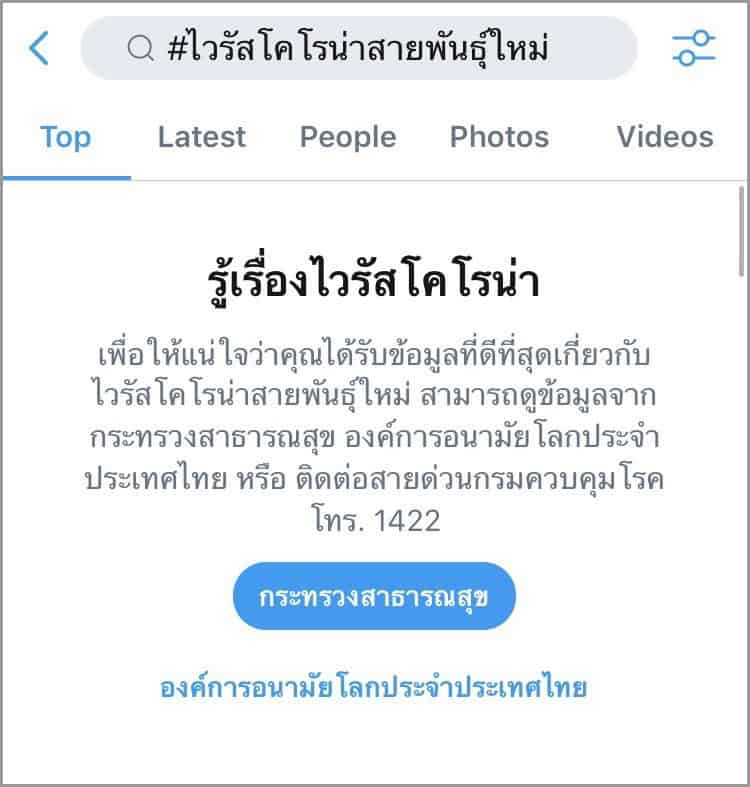 ในประเทศไทย ทวิตเตอร์ได้ร่วมมือกับ กระทรวงสาธารณสุข (@pr_moph) และองค์การอนามัยโลกประจำประเทศไทย(@WHOThailand) โดยฟังก์ชั่นใหม่นี้จะนำพาผู้ใช้งานทวิตเตอร์ไปยังแอคเคาท์ทวิตเตอร์ของทั้งสององค์กร และเบอร์ติดต่อสายด่วนของกรมควบคุมโรค กระทรวงสาธารณสุข โทร. 1422