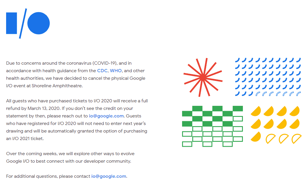 สำหรับงาน Google I/O ถือเป็นงานสัมนาใหญ่ประจำปีของนักพัฒนา ที่จัดขึ้นโดยกูเกิล เพื่อเปิดตัวและแนะนำเทคโนโลยีนวัตกรรมใหม่ ซึ่งในปี 2020 นี้กำหนดการเดิมคือวันที่ 12-14 พฤษภาคมนี้ โดยการยกเลิกทาง Google คนที่ซื้อบัตรไปแล้วจะได้เงินคืนเต็มจำนวน และจะได้รับสิทธิซื้อบัตรในงานปีหน้าอัตโนมัติ