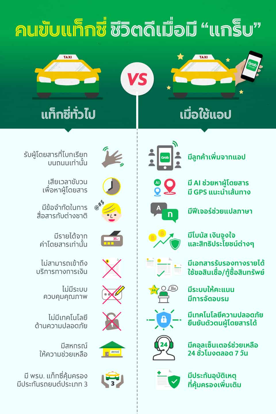5. เพิ่มศักยภาพและมาตรฐานการให้บริการ การเข้ามาของเทคโนโลยีสมัยใหม่ ๆ อย่างแอปเรียกรถทำให้คนขับแท็กซี่ต้องปรับตัวเพื่อพัฒนาความเข้าใจและศักยภาพเพื่อให้สามารถก้าวทันยุคดิจิทัลและพฤติกรรมของผู้บริโภคที่เปลี่ยนไป ถือเป็นโอกาสในการเรียนรู้และฝึกฝนพัฒนาตนเอง โดยแอปเรียกรถอย่างแกร็บยังมีการจัดอบรมต่าง ๆ ให้กับคนขับอยู่เสมอ ไม่ว่าจะเป็น เทคนิคการให้บริการ การขับขี่ปลอดภัย การดูแลสภาพรถยนต์ หรือแม้แต่คอร์สภาษาอังกฤษ นอกจากนี้ ยังมีการกำหนดหลักปฏิบัติและจรรยาบรรณของคนขับ รวมทั้งมีระบบควบคุมคุณภาพการให้บริการของคนขับแบบเรียลไทม์ ซึ่งครอบคลุมทั้งเรื่องประสิทธิภาพการรับงาน และการให้คะแนนจากผู้โดยสารเพื่อประเมินผลการทำงาน ซึ่งช่วยยกระดับมาตรฐานการให้บริการให้สูงขึ้น