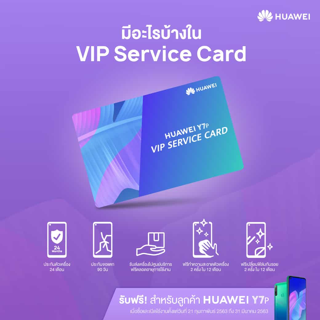 นอกจากนี้ใครที่ซื้อและเปิดใช้งาน HUAWEI Y7pตั้งแต่วันนี้จนถึง 31 มีนาคม 2563 ยังได้รับสิทธิพิเศษกับบริการHUAWEI Y7p VIP Service ทั้งการรับประกันตัวเครื่องนาน 24 เดือน ประกันจอแตกนาน 90 วัน บริการรับส่งตัวเครื่องจากหน้าบ้านไปศูนย์บริการฟรีตลอดอายุการใช้งาน รวมถึงบริการทำความสะอาดตัวเครื่องและบริการเปลี่ยนฟิล์มกันรอยสูงสุด 2 ครั้ง ภายในระยะเวลา 12 เดือน ทั้งหมดนี้มูลค่า 2,239 บาท รับกันฟรีๆ ไปเลย