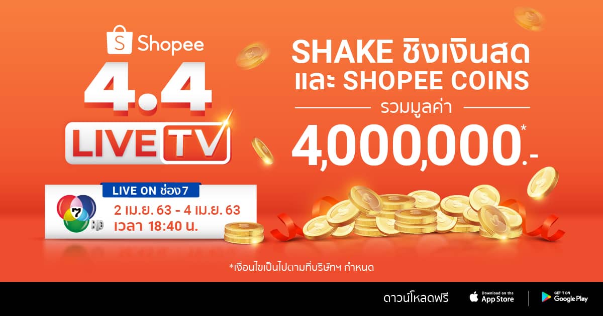 เตรียมความพร้อมเพื่อชิงรางวัลใหญ่ก่อน Shopee 4.4 Live TV กับ Shopee Shake Shake ทุกวัน: เริ่มตั้งแต่ 25 มีนาคม – 1 เมษายน 2563 ผู้ใช้งานชาวไทยสามารถร่วมสนุกกับเกมยอดนิยมอย่าง Shopee Shake Shake โดยมีสิทธิ์รับทองคำและ 400,000 Shopee coins ทุกวัน