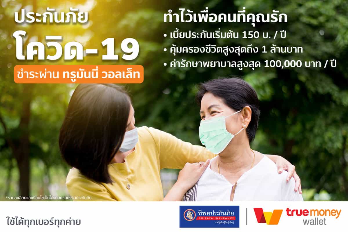 ทรูมันนี่ ผู้นำด้านบริการอิเล็กทรอนิกส์เพย์เมนท์ชั้นนำในภูมิภาคเอเชียตะวันออกเฉียงใต้ จับมือ บริษัท ทิพยประกันภัย จำกัด (มหาชน) เปิดให้บริการชำระเบี้ยเพื่อซื้อประกันภัยไวรัสโคโรน่า (COVID-19)บนอีวอลเล็ทรายแรกในประเทศไทย ผ่านแอปTrueMoney Walletได้ตลอด 24 ชั่วโมง ช่วยเพิ่มความอุ่นใจให้กับคุณและคนที่คุณรักนอกเหนือจากการป้องกันสุขภาพส่วนตัว โดยเบี้ยเริ่มต้นเพียง 150 บาท ค่ารักษาพยาบาลจากการติดเชื้อไวรัสโคโรนาตามจริงสูงสุด 1 แสนบาทต่อปี และค่าชดเชยกรณีเจ็บป่วยด้วยภาวะโคม่าหรือโรคร้ายแรงที่มีสาเหตุมาจากไวรัสโคโรน่า (COVID-19) สูงสุดถึง 1ล้านบาท