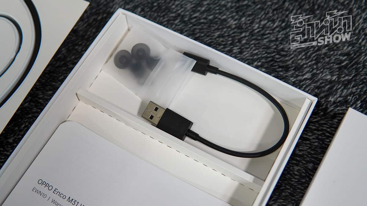 ในแพ็กเกจสินค้าของ OPPO Enco M31 จะมีอุปกรณ์อื่นๆ ให้มาด้วย เป็นสาย USB แบบสั้น ที่หัวเป็น USB-C ทำให้เวลาชาร์จค่อนข้างสะดวก ไม่ต้องพกหัวชาร์จรุ่นเก่าๆ อย่าง Micro USB ให้ยุ่งยาก และจะมีตัวจุกยางซิลิโคนให้เลือกเปลี่ยนได้อีก 2 ขนาด รวมเป็น 3 ขนาดคือ เล็ก กลาง และใหญ่ ให้เราเลือกขนาดที่เหมาะและกระชับกับขนาดรูหูของเรามากที่สุด
