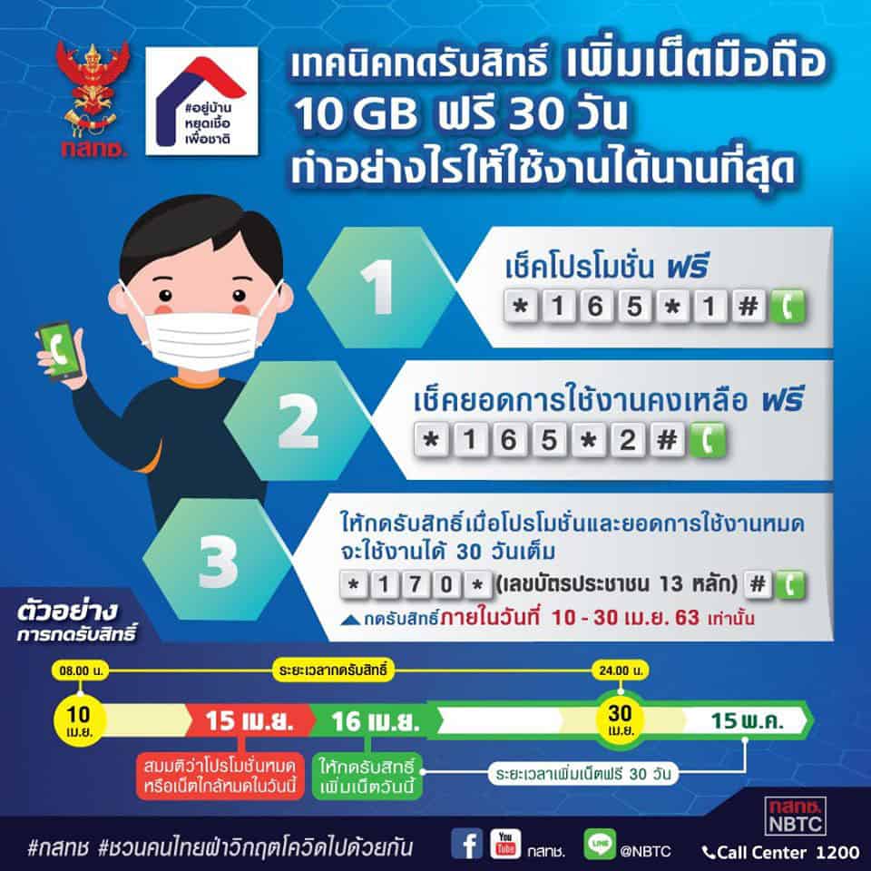 เปิดให้ทุกคนสามารถตรวจสอบ และ รับสิทธิรับเพิ่มเน็ตมือถือ 10GB ฟรี ได้ตั้งแต่วันที่ 10-30 เมษายน 2563 นี้ โดยกด *170*ตามด้วยหมายเลขบัตรประชาชน 13 หลัก# แล้วกดโทรออก ถ้าเบอร์ของท่านอยู่ในเกณฑ์ที่กำหนด ก็จะได้รับ SMS แจ้งยืนยันการรับสิทธิ จากนั้น ก็จะได้รับเพิ่มเน็ตมือถือ 10GB ฟรี เป็นเวลา 30 วัน