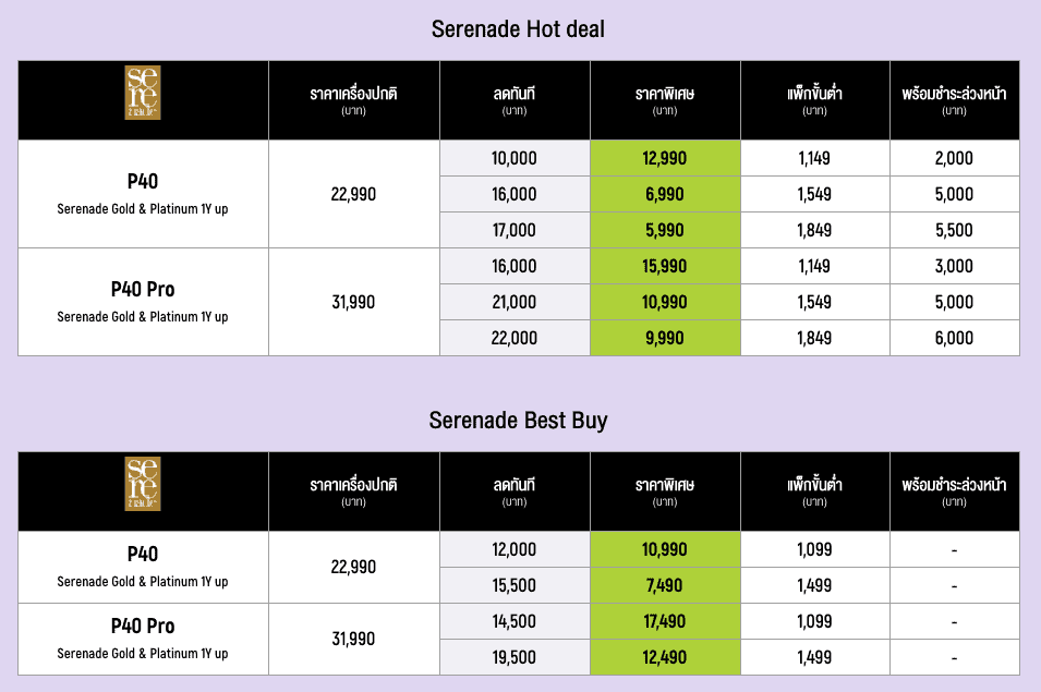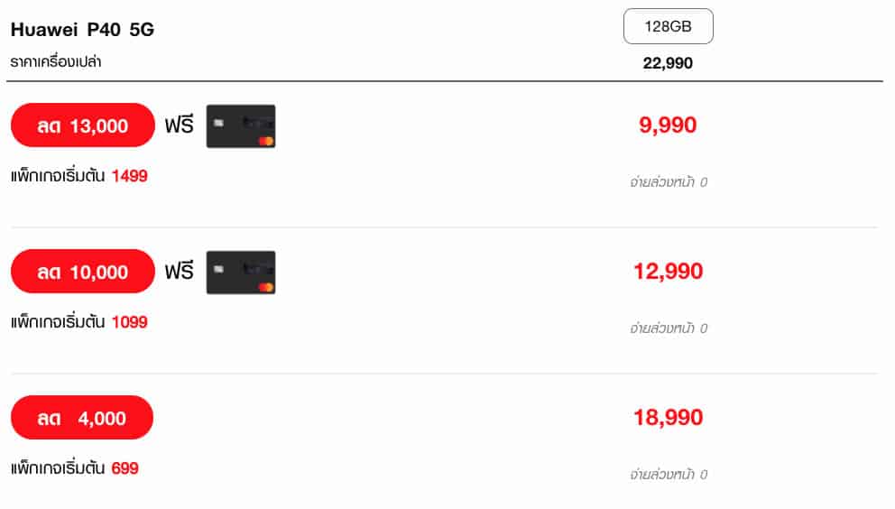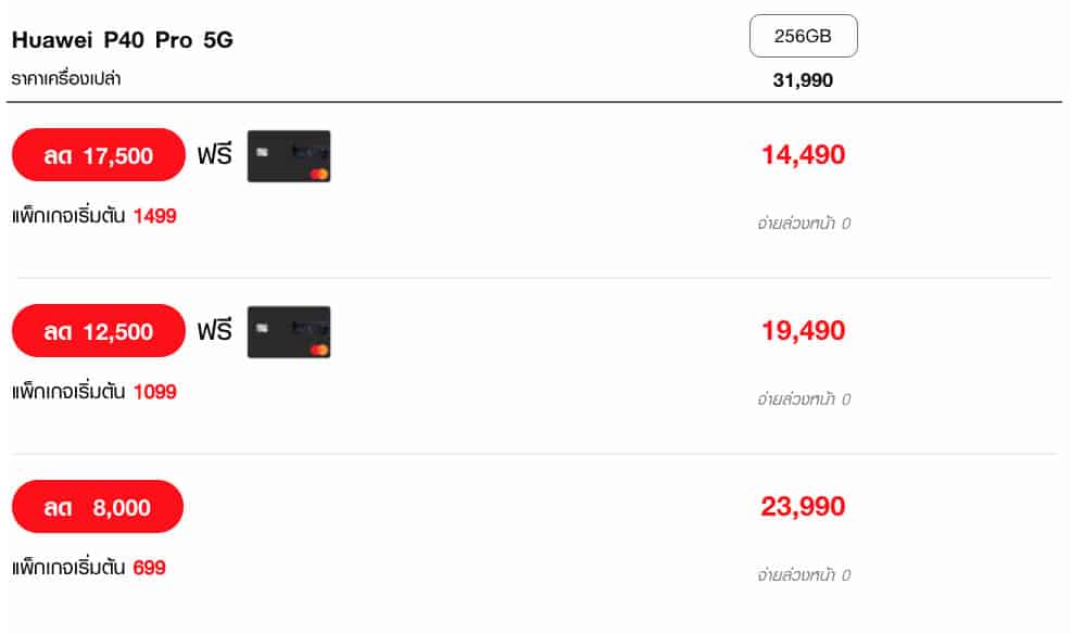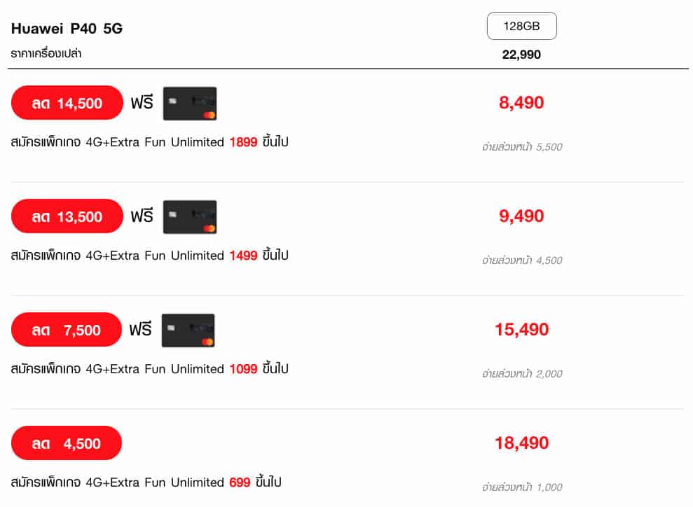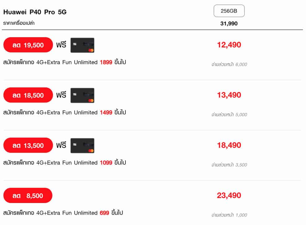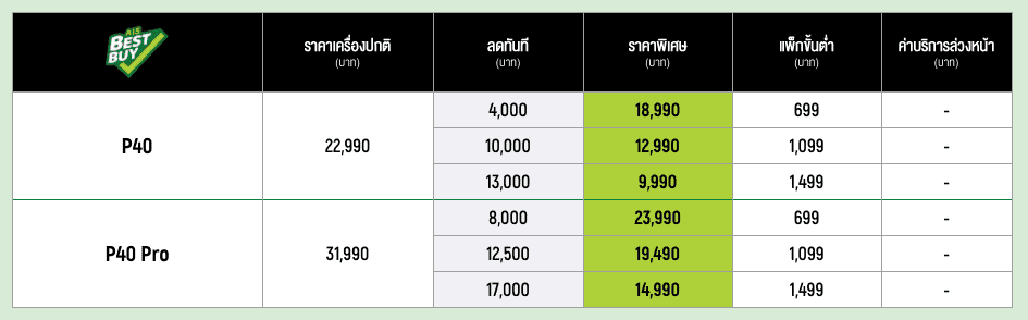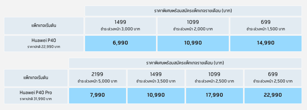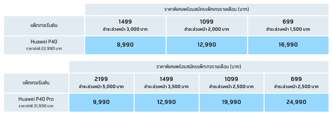P40 เริ่มต้น ราคา 5,490 บาท และ P40 Pro เริ่มต้น ราคา 9,490 บาท เมื่อใช้ทรูพอยท์ 5,000 คะแนน แลกรับส่วนลดเพิ่ม 2,000 บาท และลูกค้าย้ายค่ายเบอร์เดิม รับส่วนลดเพิ่มอีก 1,000 บาท โดยสมัครแพ็กเกจและชำระค่าบริการตามที่กำหนด