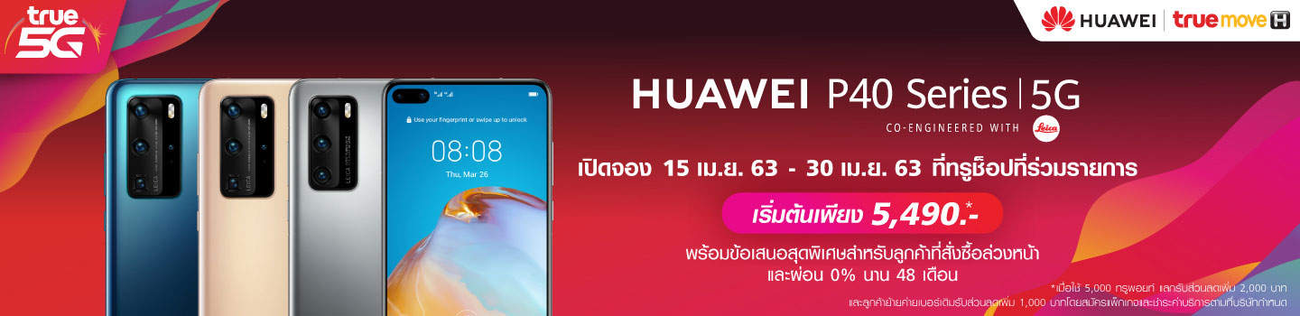 สั่งซื้อล่วงหน้า HUAWEI P40 และ HUAWEI P40 Pro กับ ทรูมูฟ เอช โปรโมชัน รับสิทธิเศษ ส่วนลดสูงสุดถึง 22,500 บาท ผ่อนชำระ 0% นานสูงสุด 48 เดือน หรือรับเครดิตเงินคืนสูงสุด 3% พร้อมสิทธิพิเศษ 11 ต่อ!