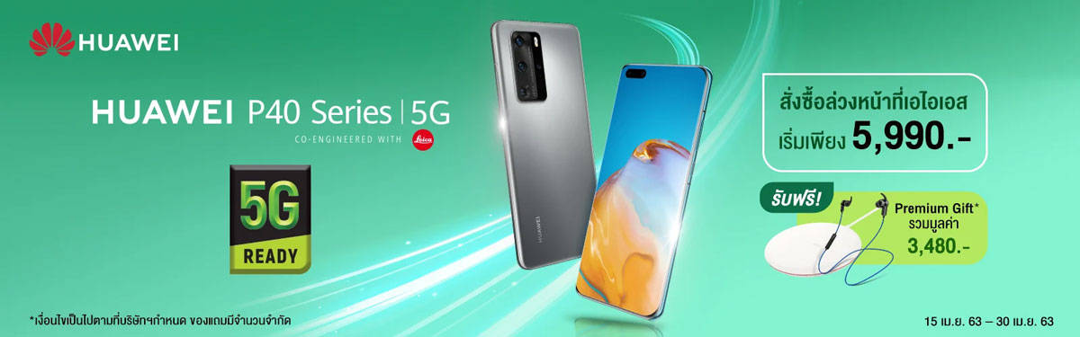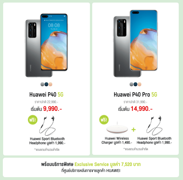 • Huawei P40 Pro 5G รับฟรี หูฟัง Huawei Sport Bluetooth Headphone มูลค่า 1,990 บาท, Huawei Wireless Charger มูลค่า 1,490 บาท Exclusive Service มูลค่า 7,520 บาท