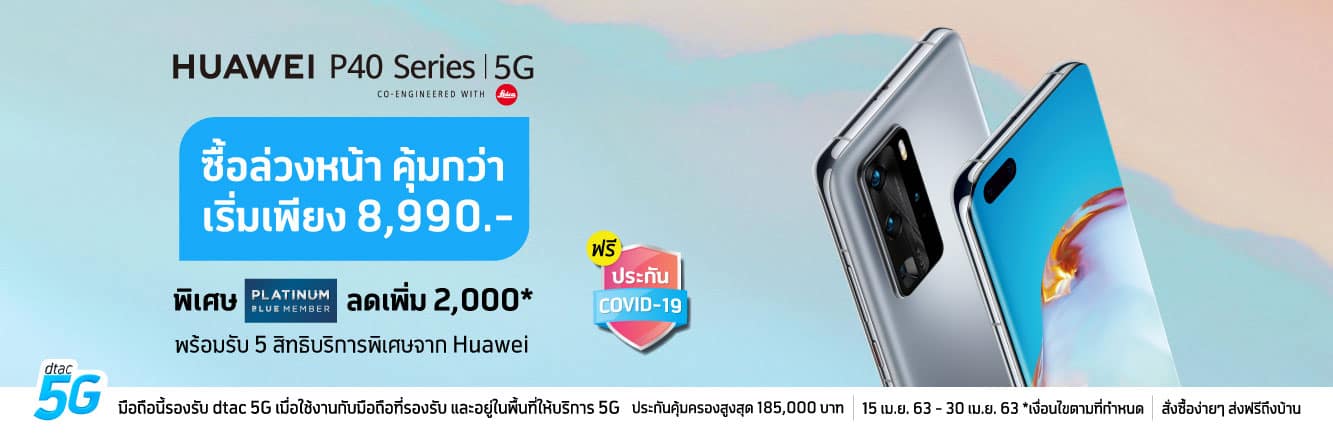 ลูกค้า ดีแทค สามารถสั่งซื้อล่วงหน้า Huawei P40 Series โปรโมชัน ราคา เริ่มเพียง 8,990 บาท พิเศษ PLATINUM BLUE MEMBER ลดเพิ่ม 2,000 บาท ตั้งแต่วันที่ 15-30 เมษายน 2563 ชำระเงินออนไลน์ พร้อมผ่อน 0% นานสูงสุด 24 เดือน ผ่านบัตรเครดิตที่ร่วมรายการ จัดส่งฟรีทั่วประเทศ 1 พฤษภาคม 2563