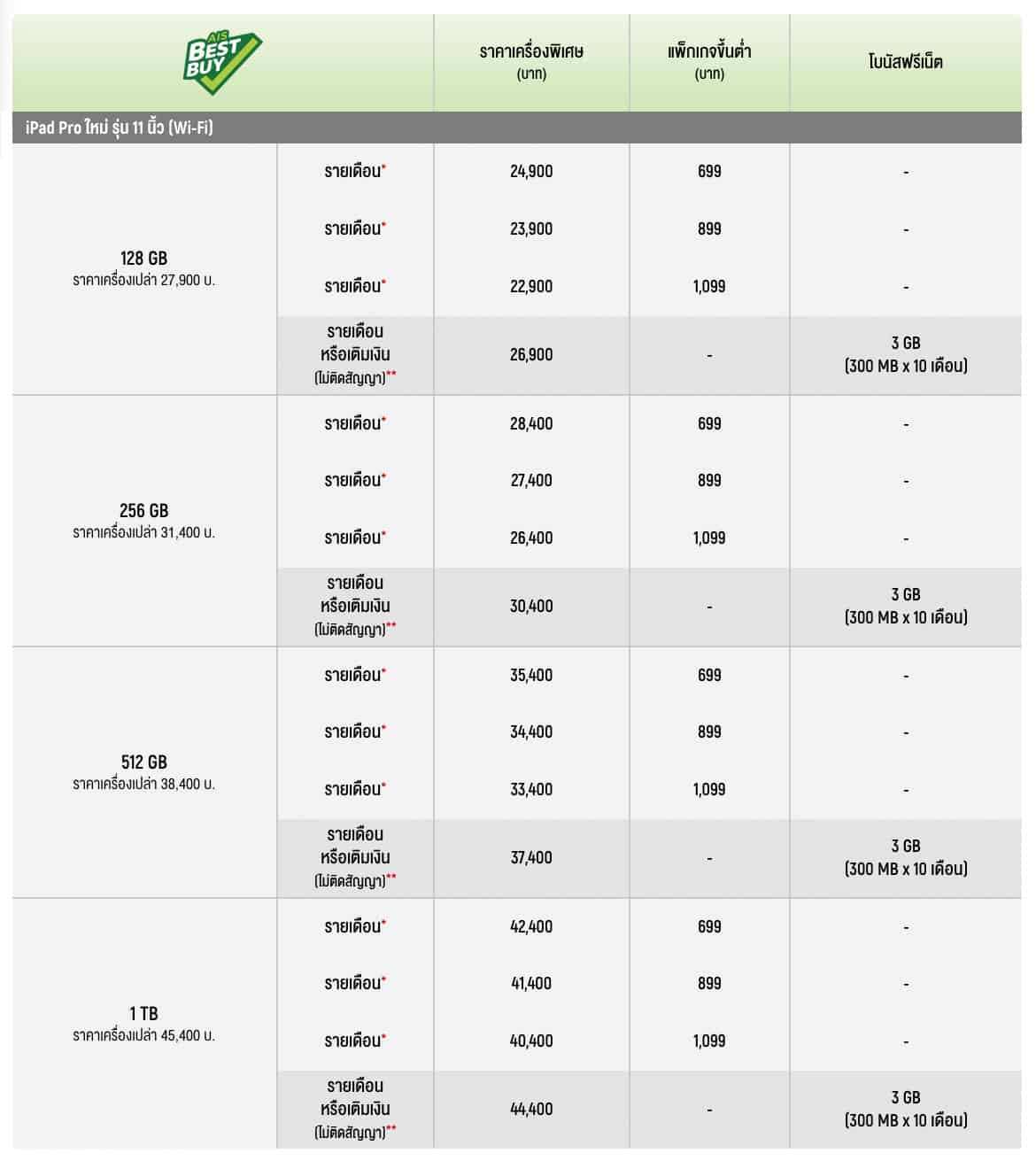โปรโมชั่น AIS BestBuy ซื้อ iPad Pro 11 นิ้ว และ 12.9 นิ้ว ใหม่ พร้อมข้อเสนอสุดพิเศษ สำหรับลูกค้าเอไอเอส ทั้งแบบรายเดือน และเติมเงิน ที่มีอายุการใช้งาน 3 เดือนขึ้นไป และมียอดการใช้งานเดือนละ 150 บาท รับสิทธิซื้อเครื่องเปล่า ราคาพิเศษ ไม่ต้องชำระค่าบริการล่วงหน้า โดยมีส่วนลดค่าเครื่องให้สูงสุดถึง 5,000 บาท