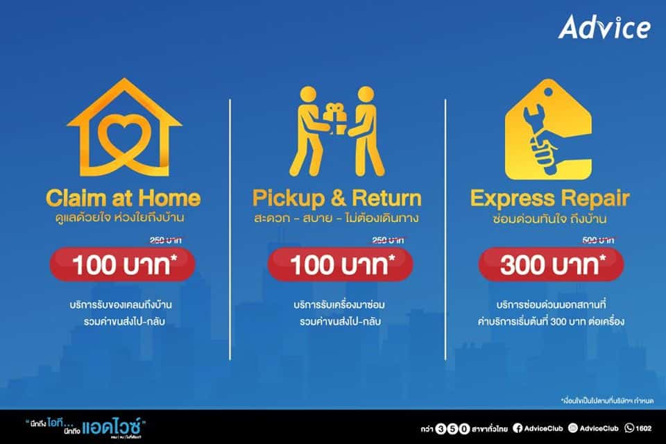 - Claim at Home ดูแลด้วยใจ ห่วงใยถึงบ้าน : จ่าย100 บาท บริการรับของเคลมถึงบ้าน รวมค่าขนส่งไป-กลับ