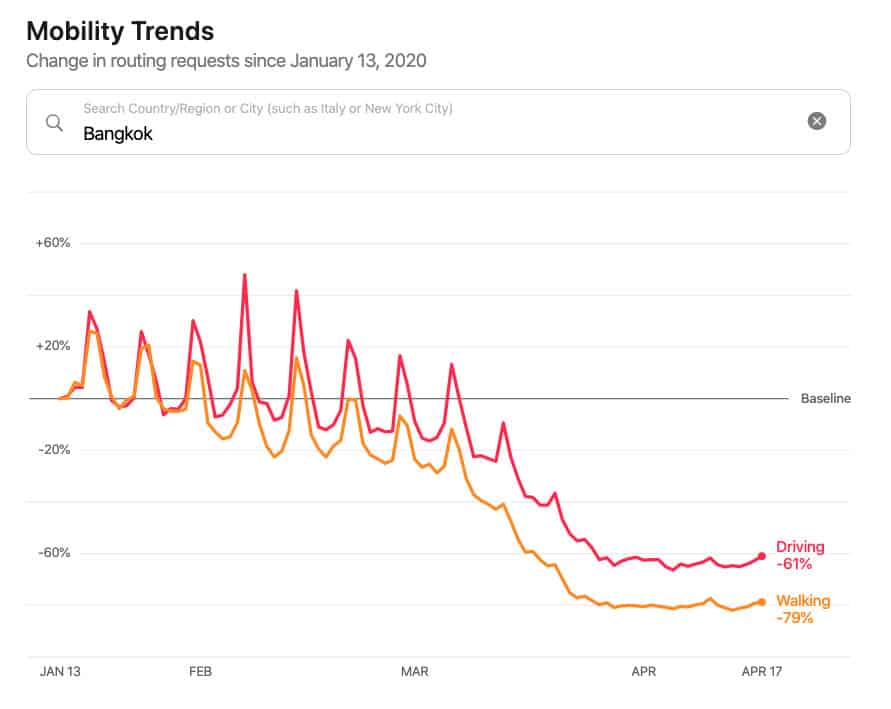 Apple เปิดตัวเครื่องมือแสดงข้อมูลแนวโน้มการเคลื่อนที่จาก Apple Maps เพื่อสนับสนุนการทำงานที่ส่งผลกระทบกับคนจำนวนมากที่กำลังเกิดขึ้นทั่วโลกเพื่อลดการแพร่กระจายของโรค COVID-19 ข้อมูลการเคลื่อนที่นี้อาจให้ข้อมูลเชิงลึกที่มีประโยชน์สำหรับภาครัฐและหน่วยงานสาธารณสุขท้องถิ่น และอาจใช้ในการวางรากฐานนโยบายสาธารณสุขใหม่ๆ โดยแสดงให้เห็นการเปลี่ยนแปลงปริมาณผู้คนที่กำลังขับรถ เดิน หรือใช้ระบบขนส่งสาธารณะในชุมชน ดูข้อมูลเพิ่มเติมเกี่ยวกับแนวโน้มการเคลื่อนที่ของ COVID-19 ได้ที่ apple.com/covid19/mobility