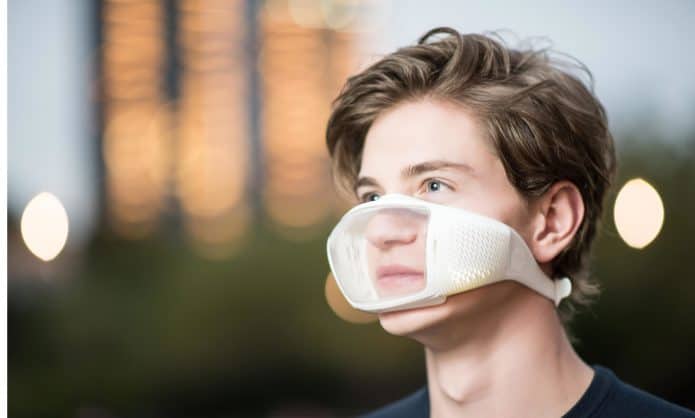 ส่วนหน้ากากนั้นใช้วัสดุพลาสติกแข็งโปร่งใสทำให้เราเห็นรอยยิ้มของผู้ใส่ได้ ส่วนที่สัมผัสกับใบหน้าของเราก็จะเป็นซิลิโคนที่อ่อนนุ่มมีสายรัดปรับระดับได้ซึ่งช่วยให้หน้ากากเหมาะสำหรับทุกคนที่สวมใส่