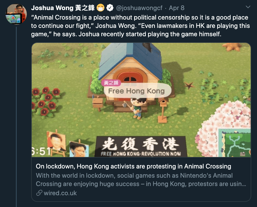 โจซัว หว่อง นักเคลื่อนไหวและผู้นำการประท้วง เพื่อเรียกร้องประชาธิปไตยในฮ่องกง ได้เริ่มเล่นเกมนี้ และใช้ฟีเจอร์สร้างแพทเทิร์นในเกม ทำป้ายประท้วงและต่อต้านรัฐบาลประเทศจีน พูดง่ายๆ ก็คือเอาเกมนี้เป็นเครื่องมือในการเผยแพร่และปลุกระดุมกลุ่มผู้ประท้วงในประเทศจีนนั่นเอง