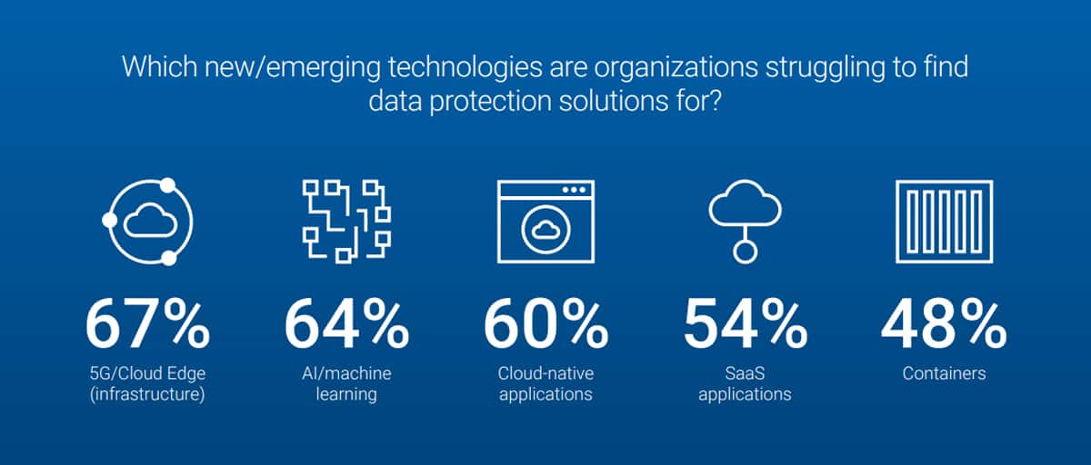 เทคโนโลยีเกิดใหม่ ความท้าทายสำหรับโซลูชันการปกป้องข้อมูล จากการที่เทคโนโลยีเกิดใหม่ หรือ emerging technologies ยังคงก้าวหน้าและเป็นตัวกำหนดภูมิทัศน์ดิจิทัล องค์กรต่างกำลังเรียนรู้วิธีการใช้เทคโนโลยีเหล่านี้เพื่อผลลัพธ์ทางธุรกิจที่ดีขึ้น การศึกษาระบุว่าองค์กรผู้ตอบแบบสอบถามในภูมิภาคเอเชียแปซิฟิกเกือบทั้งหมดกำลังลงในเทคโนโลยีใหม่หรือเทคโนโลยีที่กำลังจะเกิดขึ้นในห้าอันดับแรก (top 5) ดังนี้ 1) แอปพลิเคชันคลาวด์ หรือ cloud-native applications (64 เปอร์เซ็นต์) 2) ซอฟต์แวร์ในรูปแบบการบริการ (software-as-a-service: SaaS) (58 เปอร์เซ็นต์) 3) ปัญญาประดิษฐ์ (AI) และแชชีน เลิร์นนิ่ง (ML) (50 เปอร์เซ็นต์) 4) 5G และโครงสร้างพื้นฐานคลาวด์ เอดจ์ (49 เปอร์เซ็นต์) และ 5) อินเทอร์เน็ต ออฟ ธิงส์/เอ็นด์ พ้อยต์ (end point) (45 เปอร์เซ็นต์)