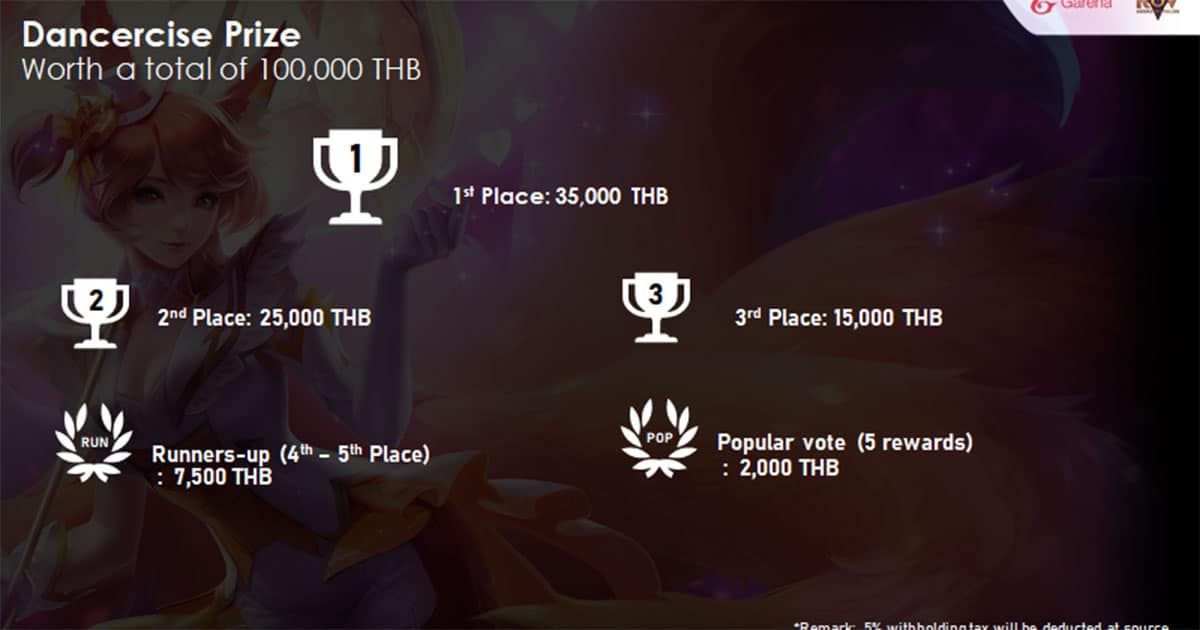 ผู้สนใจสามารถเข้าร่วมกิจกรรมได้ผ่านช่องทางสื่อสังคมออนไลน์ ได้แก่ เฟซบุ๊ก อินสตาแกรม และ tiktok ของ Garena RoV Thailand สำหรับรางวัลในการประกวด RoV Dance Challenge รางวัลชนะเลิศจะได้รับเงินรางวัล 35,000 บาท รางวัลที่ 2 เงินรางวัล 25,000 บาท รางวัลที่ 3 เงินรางวัล 15,000 บาท รางวัลที่ 4 และ 5 รางวัลละ 7,500 บาท และรางวัลขวัญใจประชาชน (Popular vote) จำนวน 5 รางวัล รางวัลละ 2,000 บาท ติดตามรายละเอียดและกติกาการแข่งขันได้ทาง https://www.facebook.com/ROVTH/