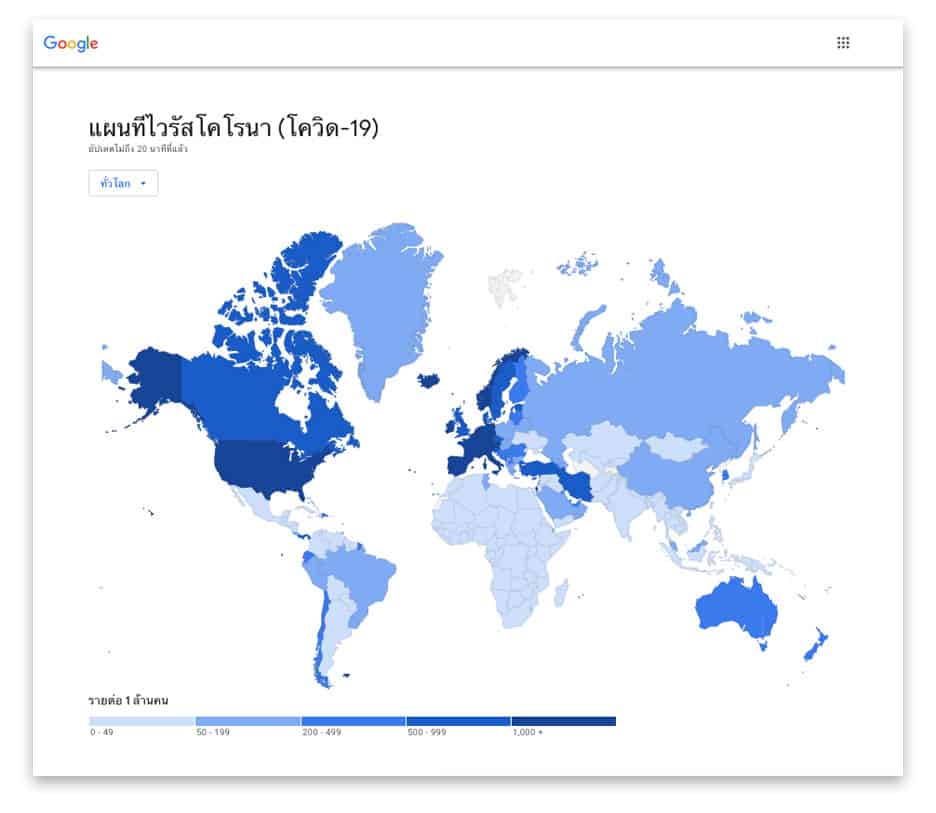 ในขณะนี้ที่ผู้คนทั่วโลกต่างเฝ้าระวังและรับมือกับสถานการณ์การแพร่ระบาดและการติดเชื้อไวรัสโคโรนา 2019 หรือ COVID-19 และปฏิบัติตามมาตรการต่าง ๆ เพื่อช่วยชะลออัตราการแพร่ระบาดของไวรัสและเพื่อความปลอดภัยของทุกคนนั้น Google Search ช่วยให้คนไทยค้นหาข้อมูลของ COVID-19 ได้ง่ายขึ้น ด้วยการค้นหาคำว่า “โคโรนา” หรือ “โควิด-19” หรือ “โควิด19 หรือ “โควิด 19” เป็นภาษาไทย ก็จะพบกับชุดข้อมูลครอบคลุมตั้งแต่ ภาพรวมของโรคติดเชื้อไวรัสโคโรนา (COVID-19) อาการ การป้องกัน การบำบัดรักษา สถิติของทุกประเทศทั่วโลก รวมไปถึงข่าวอัปเดตเรียลไทม์ทั้งจากในไทยและทั่วโลกจากสำนักข่าวต่างๆ อย่างครบถ้วน