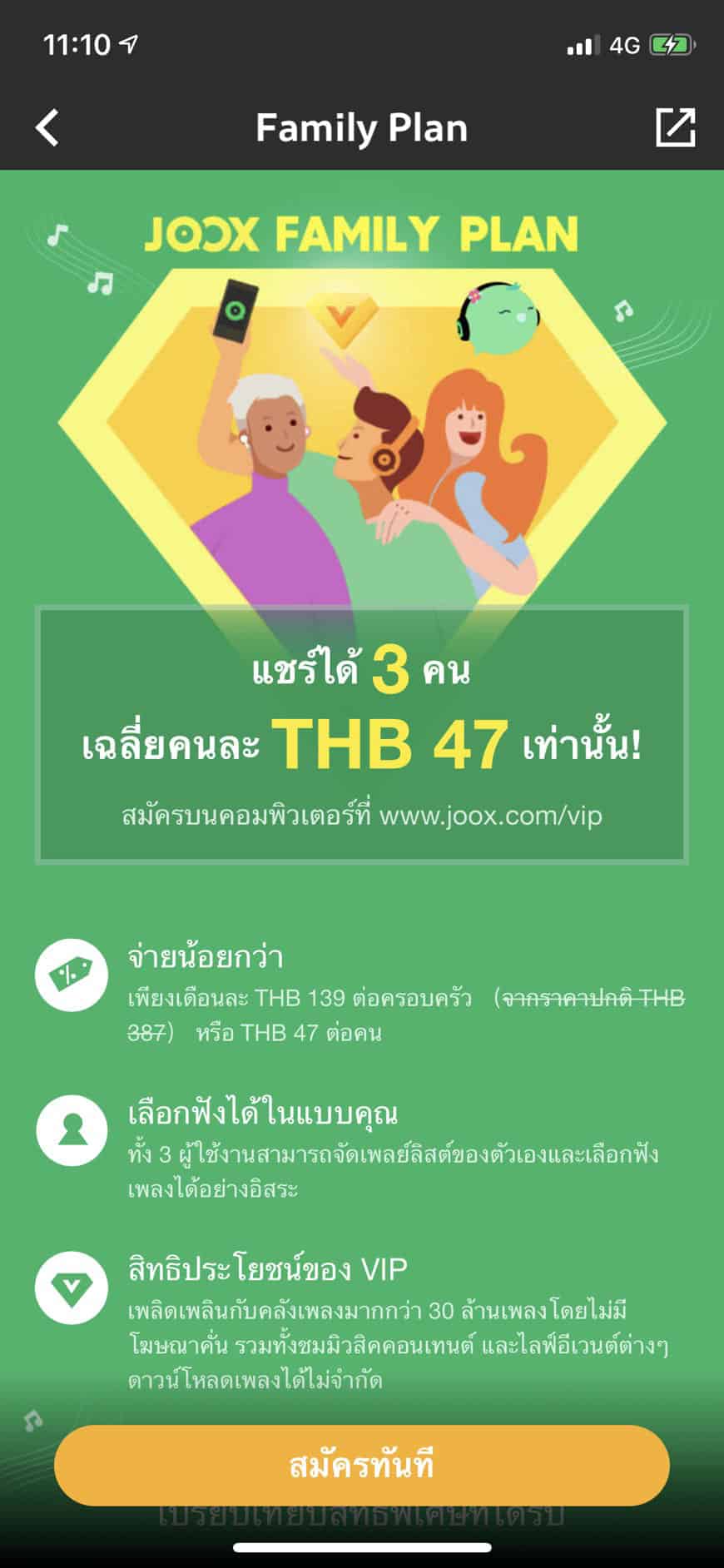 การสมัคร JOOX FamilyPlan จะทำให้สมาชิกในครอบครัว สามารถแบ่งปันช่วงเวลาแห่งความสนุก ผ่านการร้อง ฟัง การเพลิดเพลินกับเพลงฮิตต่างๆ มากมาย ปัจจุบัน JOOX FamilyPlan พร้อมให้สมัครและใช้งานได้ทั้งบนมือถือและเดสก์ท็อป ในราคาเพียงแค่ 139 บาทต่อเดือน หรือเฉลี่ยแค่คนละ 47 บาทเท่านั้น ซึ่งจะทำให้ผู้ใช้งานสามารถเข้าถึงเพลงต่างๆ หลากหลายแนวเพลง ได้มากถึงกว่า 30 ล้านเพลง ให้เลือกฟังได้ตามความชอบของแต่ละบุคคล