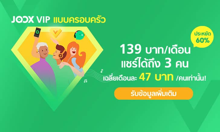 JOOX เปิดแพ็กเกจใหม่ JOOX Family Plan สำหรับสมาชิกในครอบครัว ใช้ได้สูงสุด 3 คน ในราคาเดือนละ 139 บาท เฉลี่ยแล้วแค่คนละ 47 บาท ให้ทุกคนในครอบครัวเพลิดเพลินกับการฟังเพลงคุณภาพสูง และความบันเทิงอื่นๆ ได้แบบไม่มีสะดุด